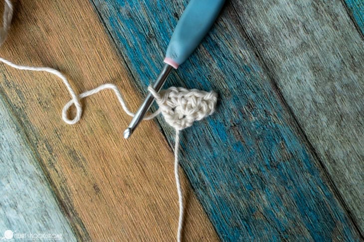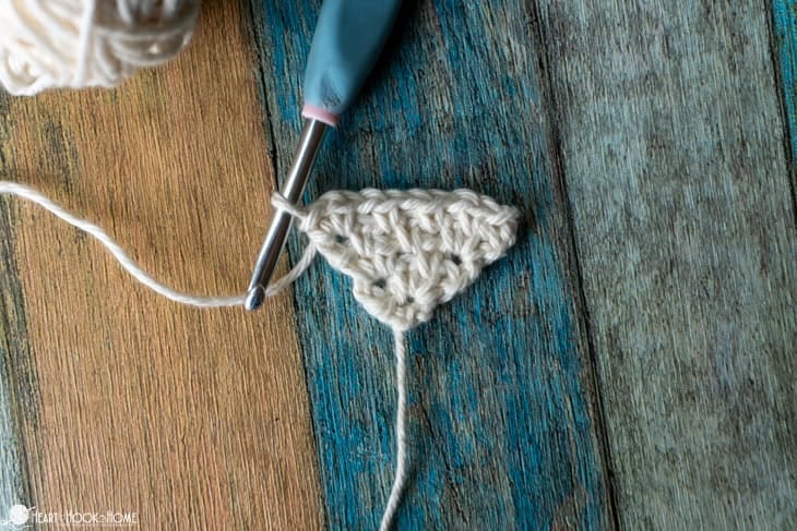 2. Chain three and turn, skip the first single crochet and place (sc, ch-1, sc) in the chain space from the previous row.