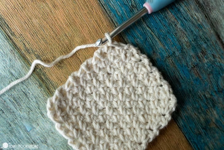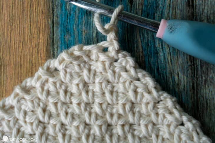 5. Chain three and turn, skip the first single crochet and (sc, ch-1) in the each chain space across. When you get to the end, sc in the beginning chain of the previous row without placing a chain in between.