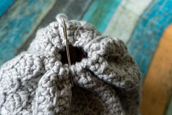 When you reach the top, feed yarn needle through the ends of the rows, cinching up as you go. Weave in all ends and you are almost finished!