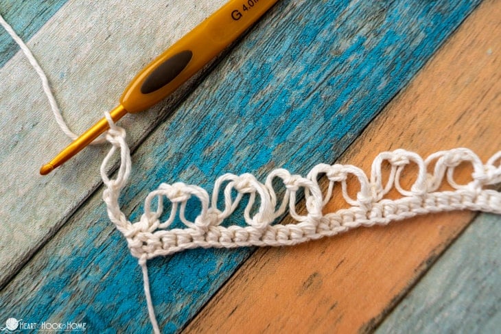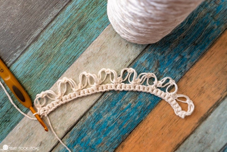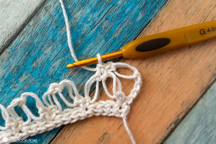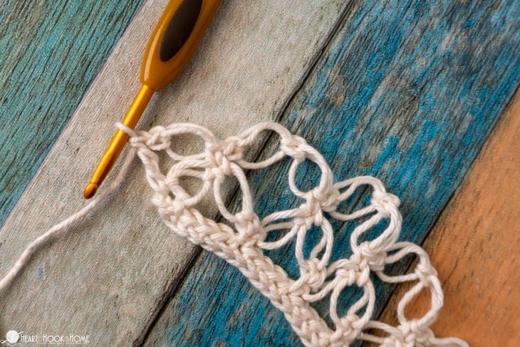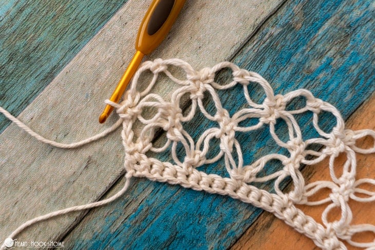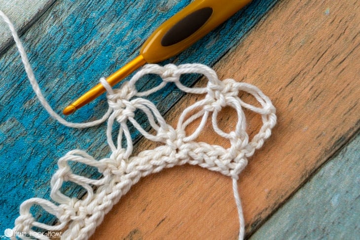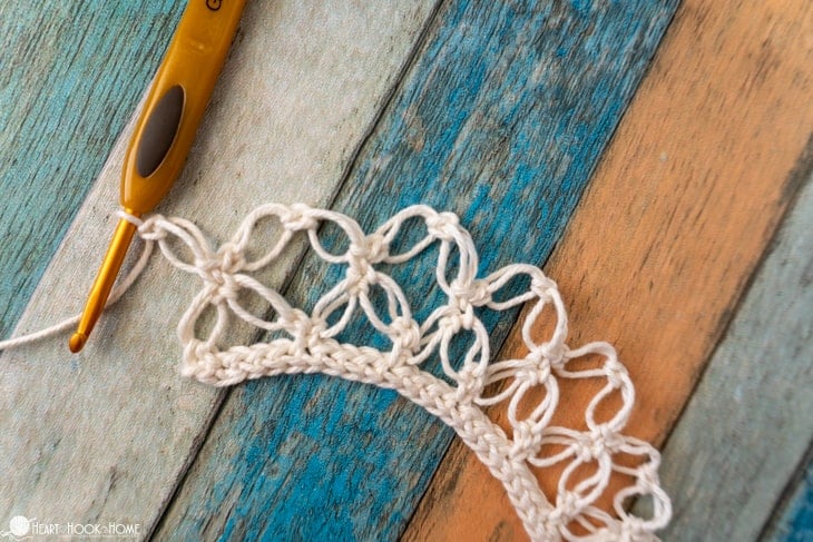 Row 4: Ch-1, turn, sc in first st. * Lk two times, sc in center sc of next Lk set * repeat between * * to end, sc in top of ch-4. (8 Lk sets)