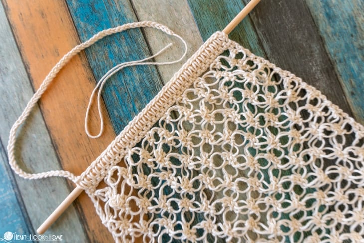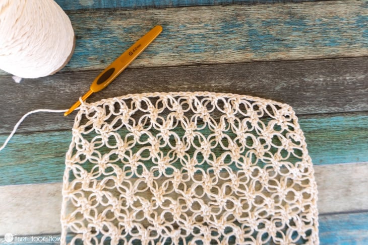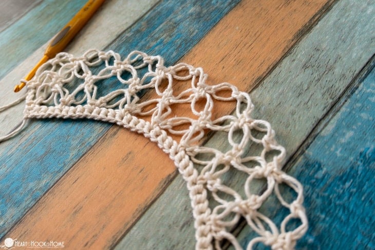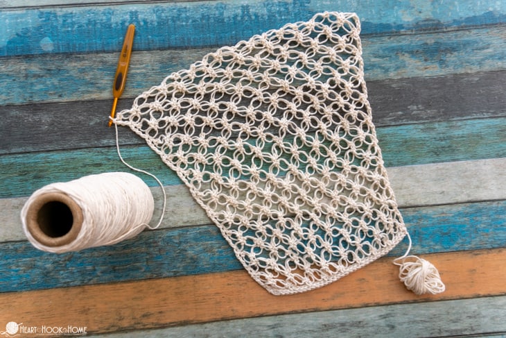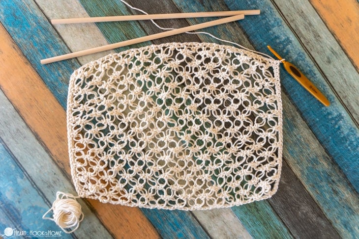 You’ll notice that the hammock looks more like a triangle than a rectangle at this point, but when we add row 22 that pulls it back in and helps create the sagging hammock effect that will keep the fruit nice and cradled.