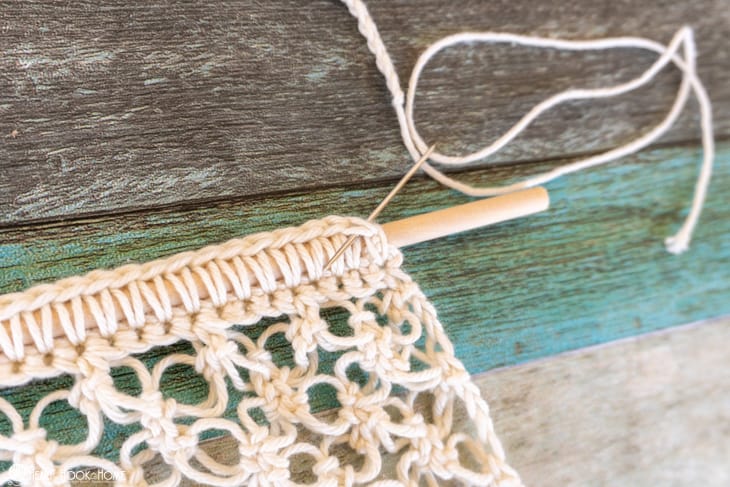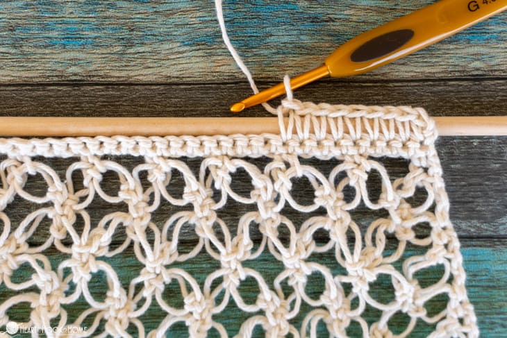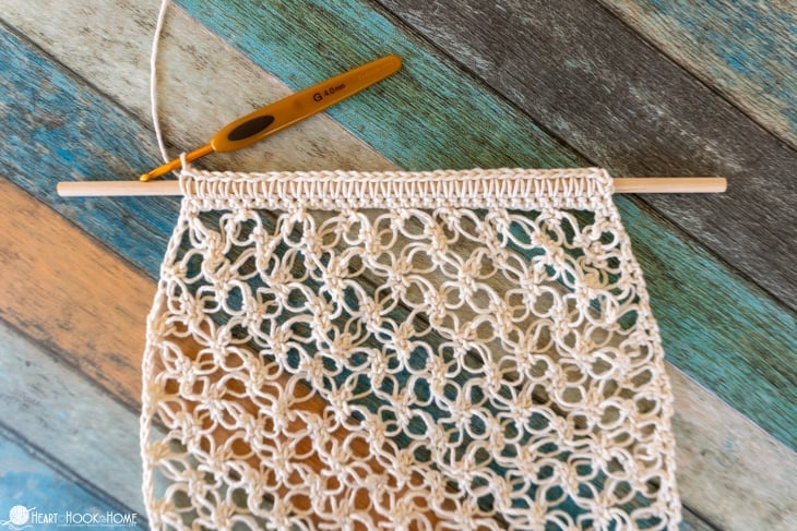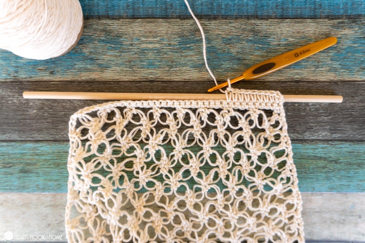 For this pattern we are basically crocheting a net rectangle, then crocheting around a dowel rod on both ends. Then we’ll add loops to each side so that it can hang under your cabinet using Command hooks. Brilliant!