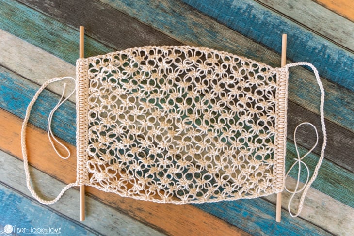 On other side using beginning yarn tail and crocheting around the second dowel rod, sc in each st to end. Ch-60 and attach to opposite side. Go around the actual dowel rod a few times to further secure. Weave in all ends.