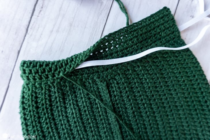 For smaller sizes I recommend adding elastic. If so, add three extra rows on the waistband (for seven rows total). Fold it back and baste stitch together, encompassing the elastic. Before completely shutting in elastic, use needle and thread to sew elastic together. Weave in all ends.