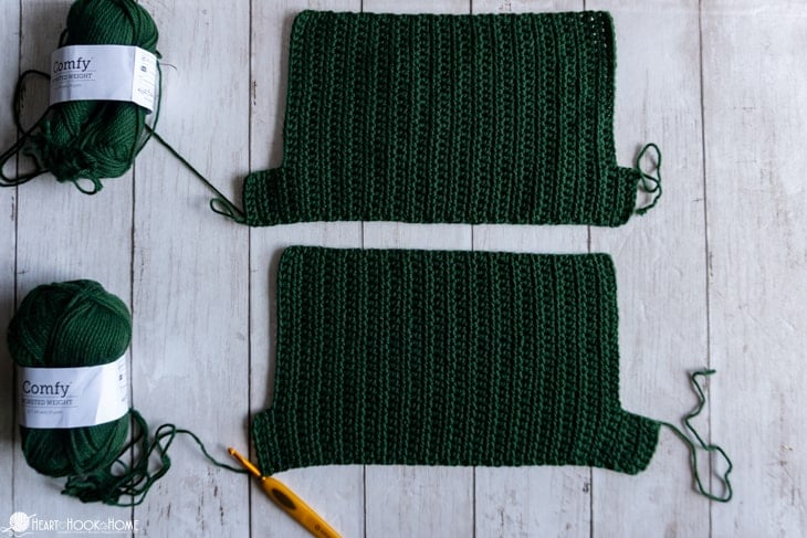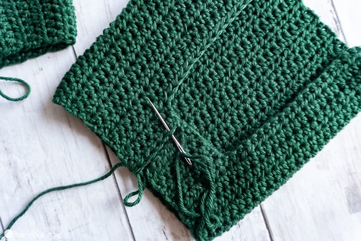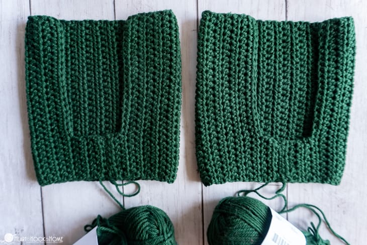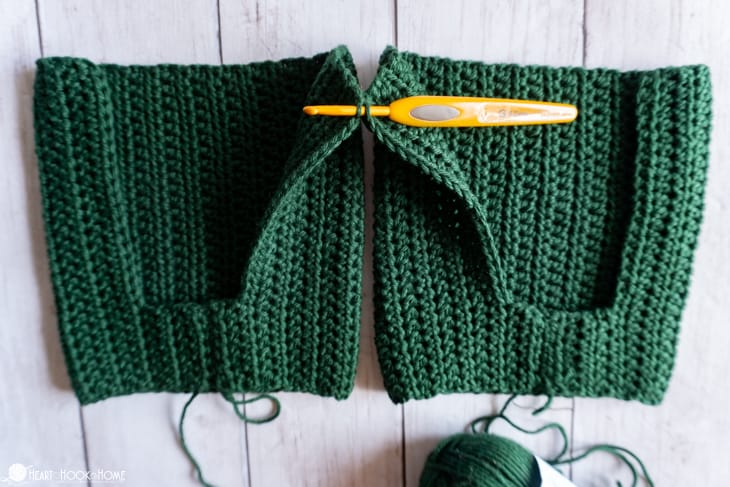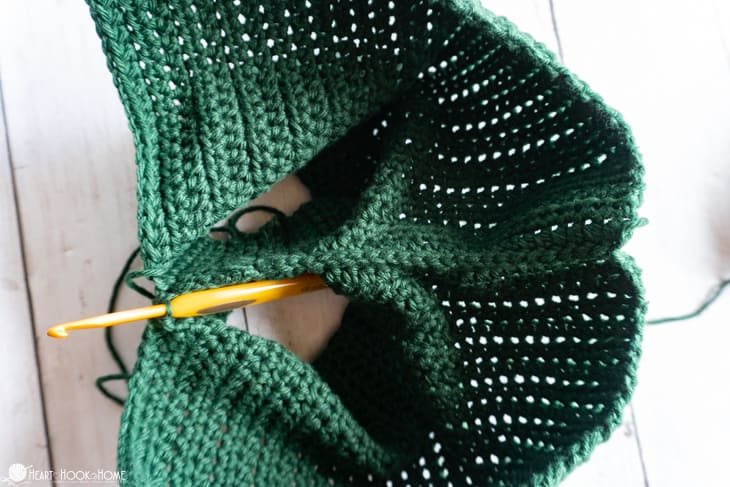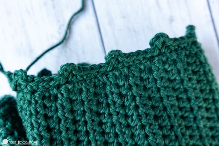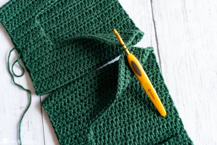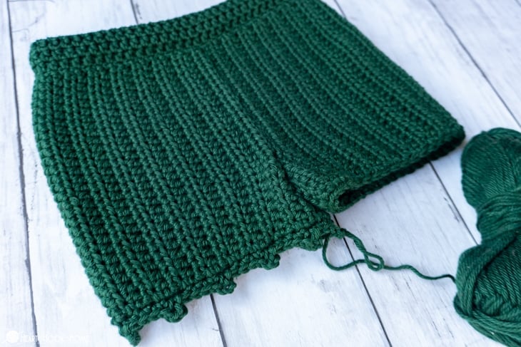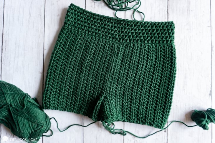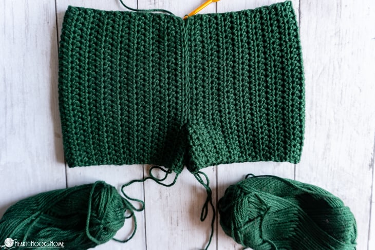 When you reach the crotch, be liberal with your stitches. Before starting on the second side line up the remaining sts so youโre not left with any extra. When finished, do not fasten off.