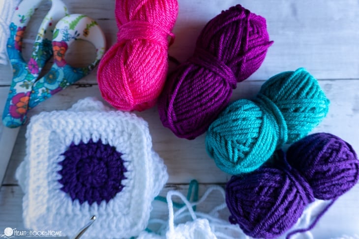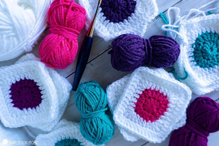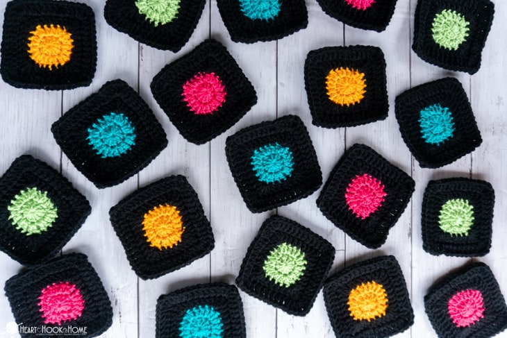 Using these Brava Mini skeins, we’ll make an assortment of solid granny squares that are bright, fun, and cheery. Then we’ll assemble them into one large rectangle, we’ll add an optional fabric lining, then cinch up the sides and sew on some handles. Aren’t these just so fun?! I love them and I hope you do, too!