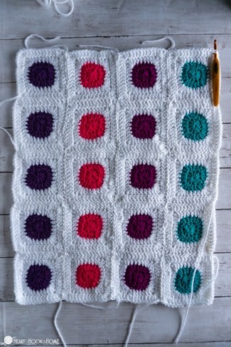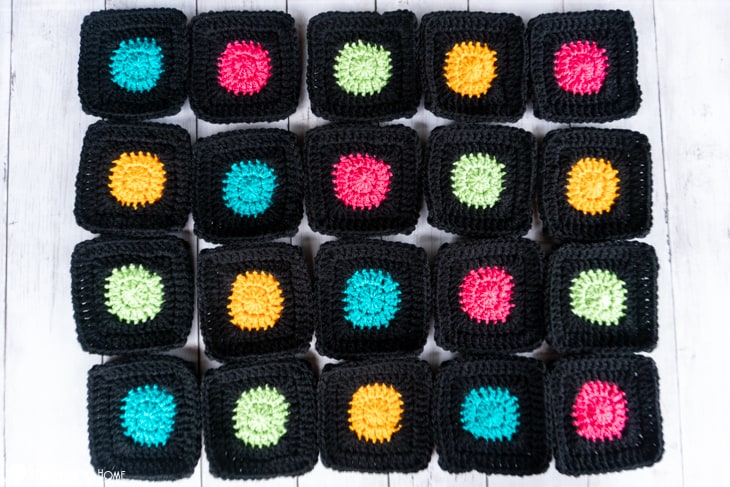 Decide on the arrangement of your squares, then sew all 20 squares together using the Mattress Stitch, 4 wide and 5 tall.