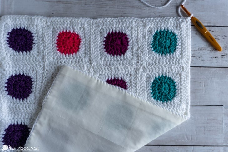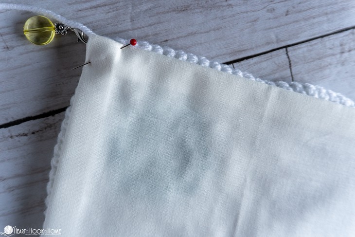 Sew fabric lining to โwrong sideโ of the crocheted rectangle, being careful not to sew the crochet stitches shut so you can crochet into them in the next portion.