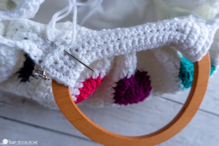 Line up the strap around the wooden handle and sew into place. I used those 13 stitches that formed the “strap” rows and pinned it into place with a stitch marker while sewing. Weave in all of your ends and you are finished!